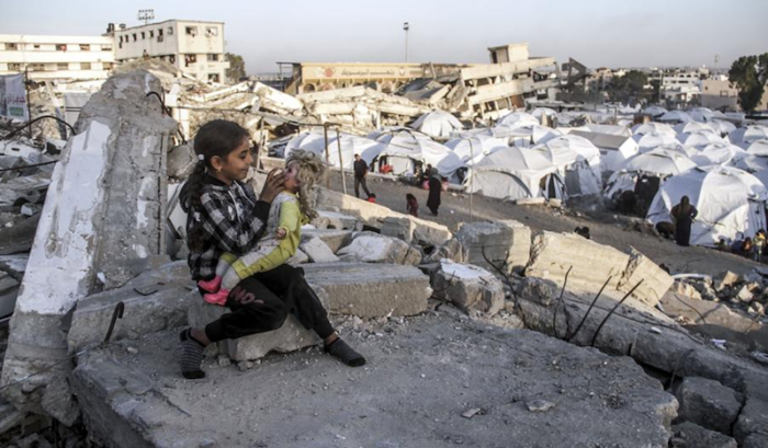 A displaced Palestinian child plays in a shelter in Gaza City on Dec. 9, 2024.